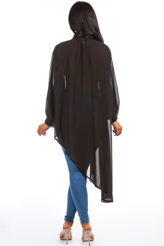 Long Sleeve Asymmetric Chiffon Blouse Top - Black