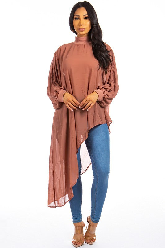 Long Sleeve Asymmetric Chiffon Blouse Top - Brown